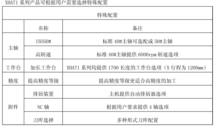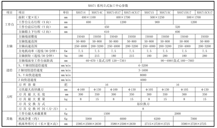 XHA71系列立式加工中心能夠保證低速區(qū)的大扭矩和高速區(qū)的大功率的協(xié)調(diào),主軸剛性高,保證主軸加工時(shí)的平穩(wěn)性和強(qiáng)力切削實(shí)現(xiàn)零件的高表面光潔度。